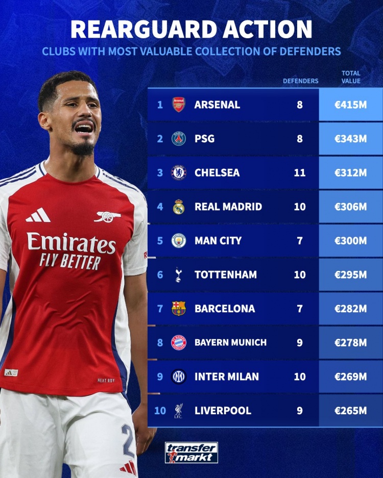 9月24日讯 德国转会市场统计了各队阵形 中后场球员球员的总身价,并列出榜单,足球直播无插件免费在线观看阿森纳4.15亿欧居首,巴黎、切尔西二三位。