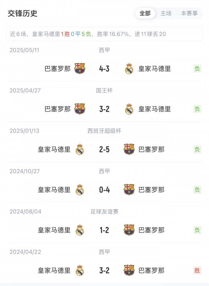 赛前皇马8胜1负积24分居首,巴萨7胜1平1负22分排名次席。这是两队本赛季的首次交手,此前4次正式赛事 交手,足球直播无插件免费在线观看巴萨对皇马取得四连胜。