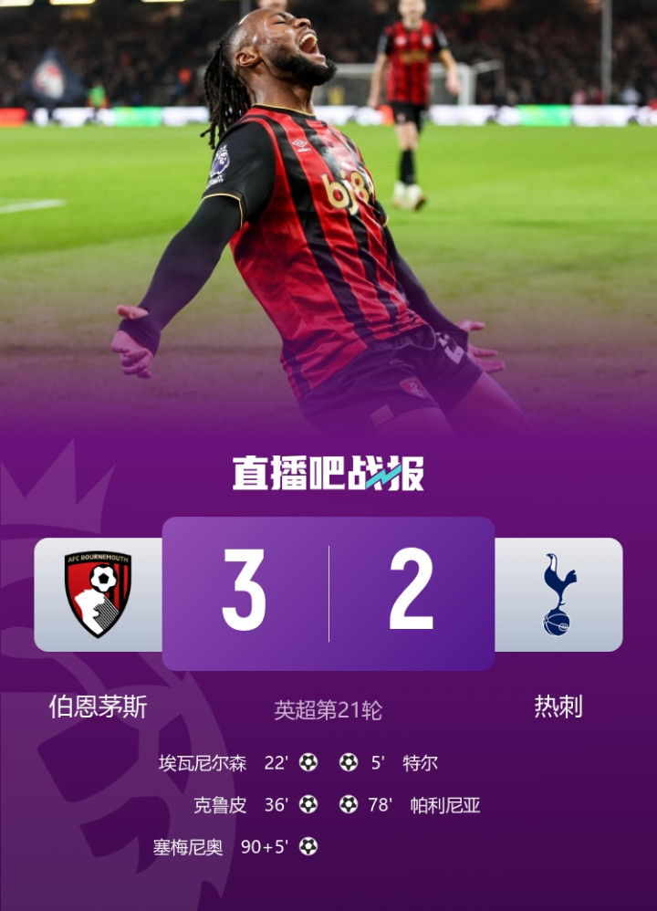 伯恩茅斯3-2战胜热刺,塞梅尼奥95分钟致胜球 。此前talkSPORT报道,塞梅尼奥坚守 为伯恩茅斯出战(球员解约条款10号截止),希望帮助球队终结11场不胜。
