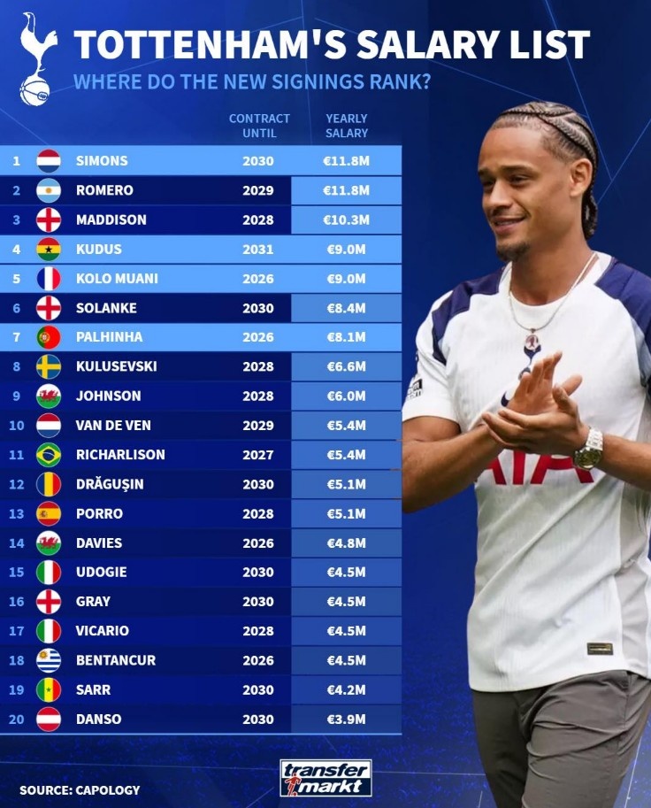 9月13日讯 德转盘点了热刺队内目前的年薪榜,其中多名新援位居前列,欧洲杯直播吧具体如下: