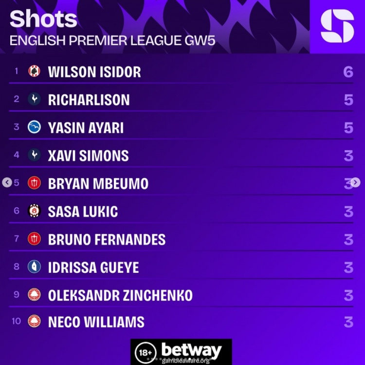 英超第5轮射球 榜: