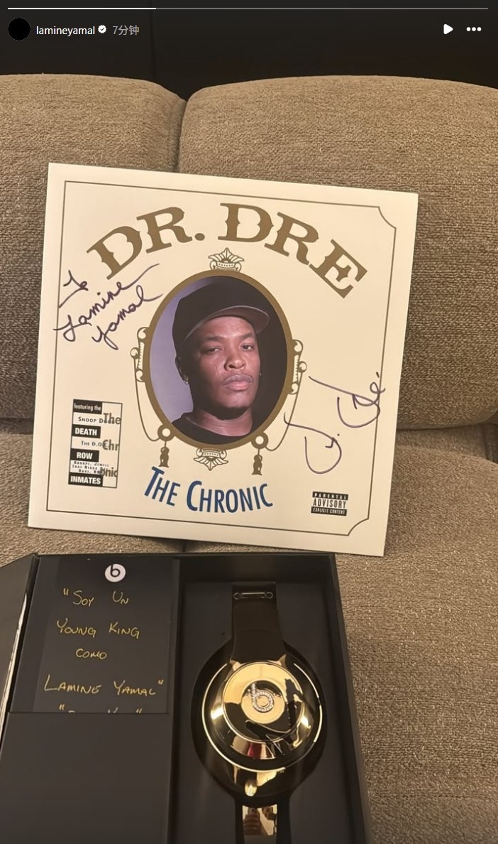 亚马尔晒出了Dr. Dre的TO签处女专辑《The Chronic》(1992年发行英超在线观看免费,销量超540万张),以及金色的Beats耳机。