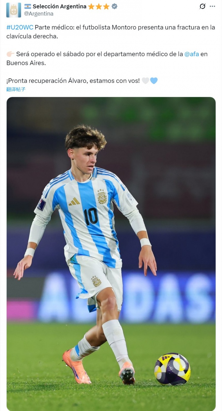 10月9日讯 阿根廷足协官方确认,阿根廷U20中场球员蒙托罗右锁骨骨裂 。