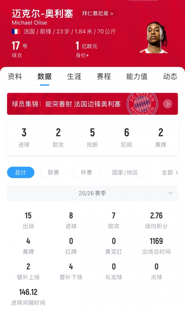 奥利塞现年23岁,司职右翼锋,他本赛季为拜仁出战15次,贡献8球7助,他与拜仁的合同在2029年到期,现身价1亿欧。拜仁方面声称无意出售奥利塞,并希望在未来继续留住他,据悉,奥利塞与拜仁没有解约金条款。