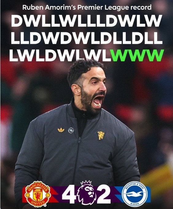 10月26日讯 英超第9轮赛事 ,曼联在老特拉福德以4-2的比分战胜布莱顿,取得职业联赛 3连胜。