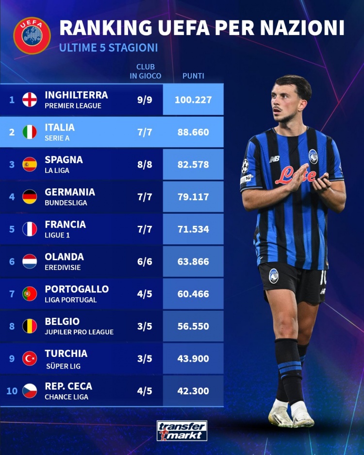11月6日讯 德国转会市场列出了各国职业联赛 的欧战总积分排名,英超居首,免费欧洲杯直播意甲、西甲二三位。
